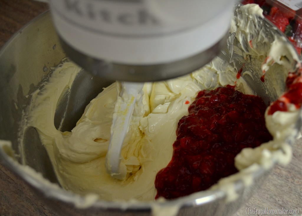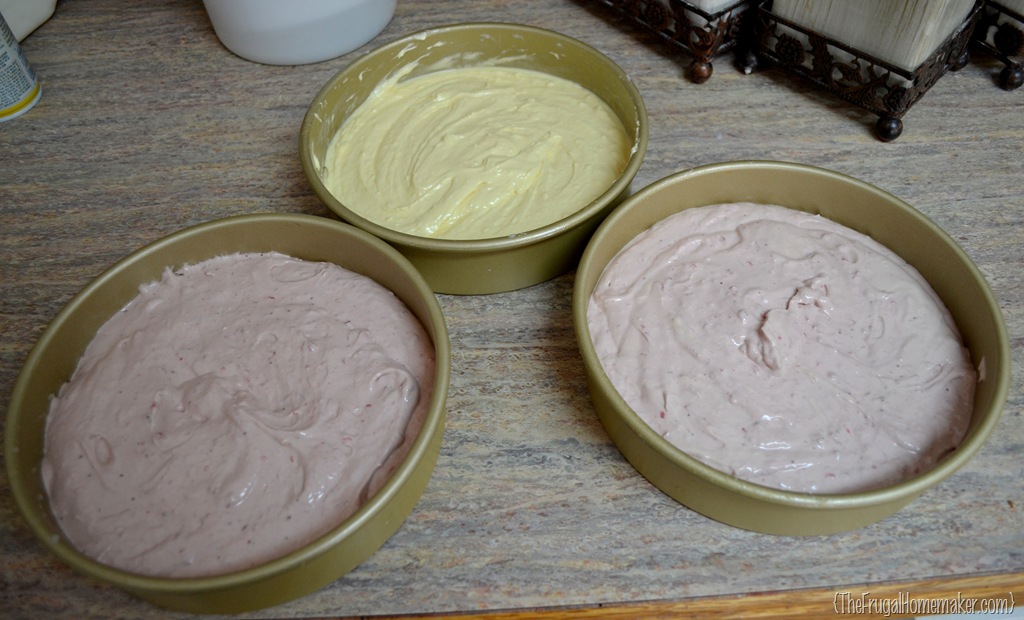 Mix in your mashed strawberries with the other 2/3 of batter.  (You can add some red food coloring if you really wish it to be pink/red in color.)