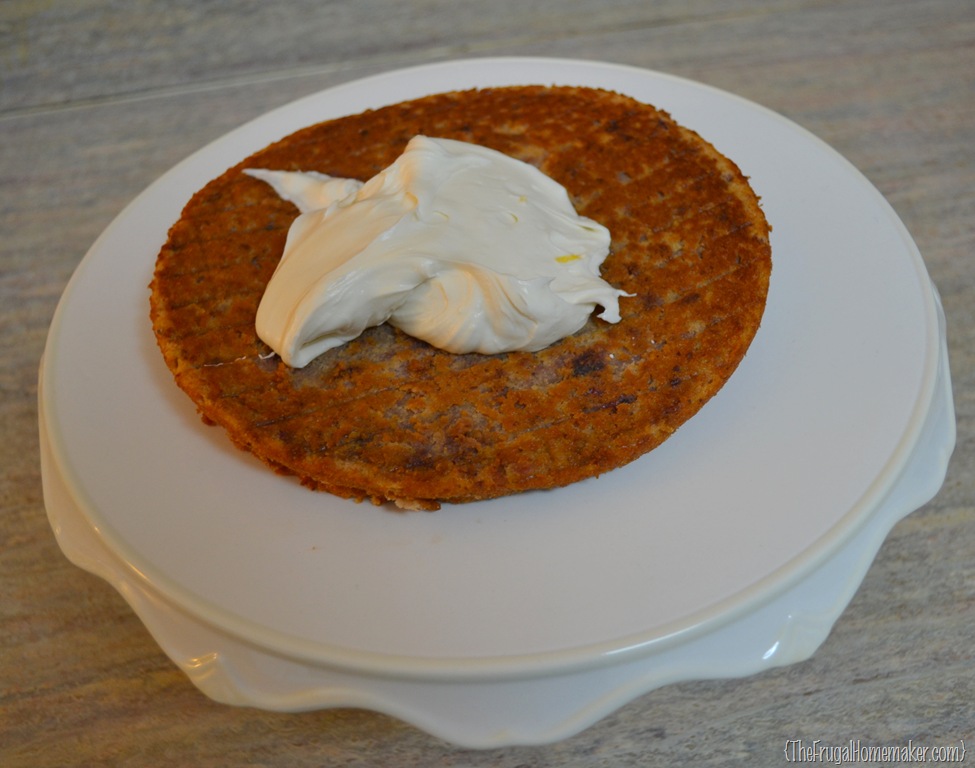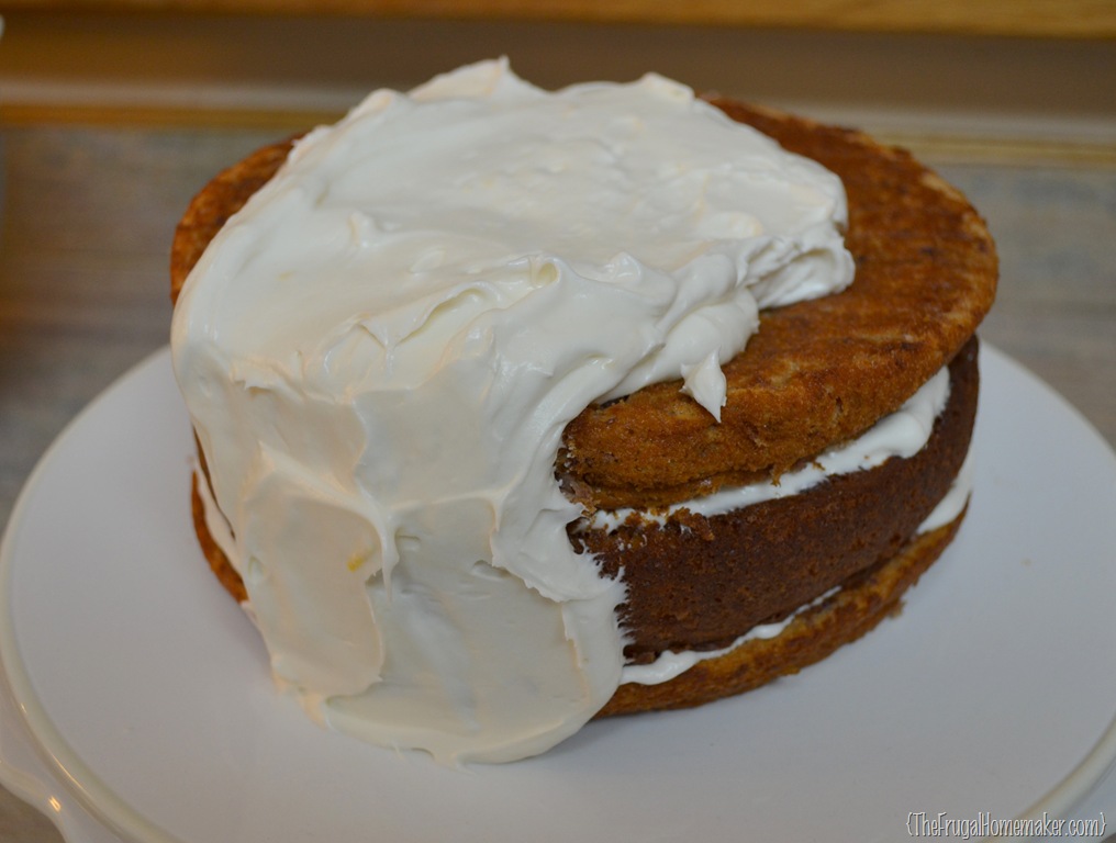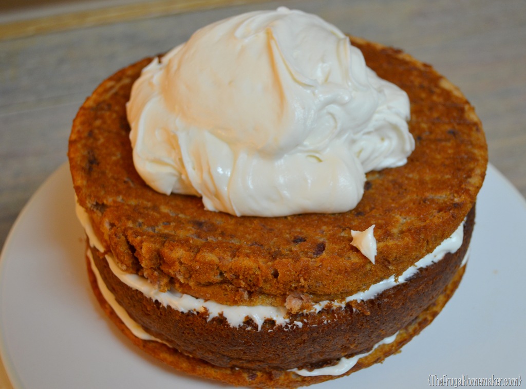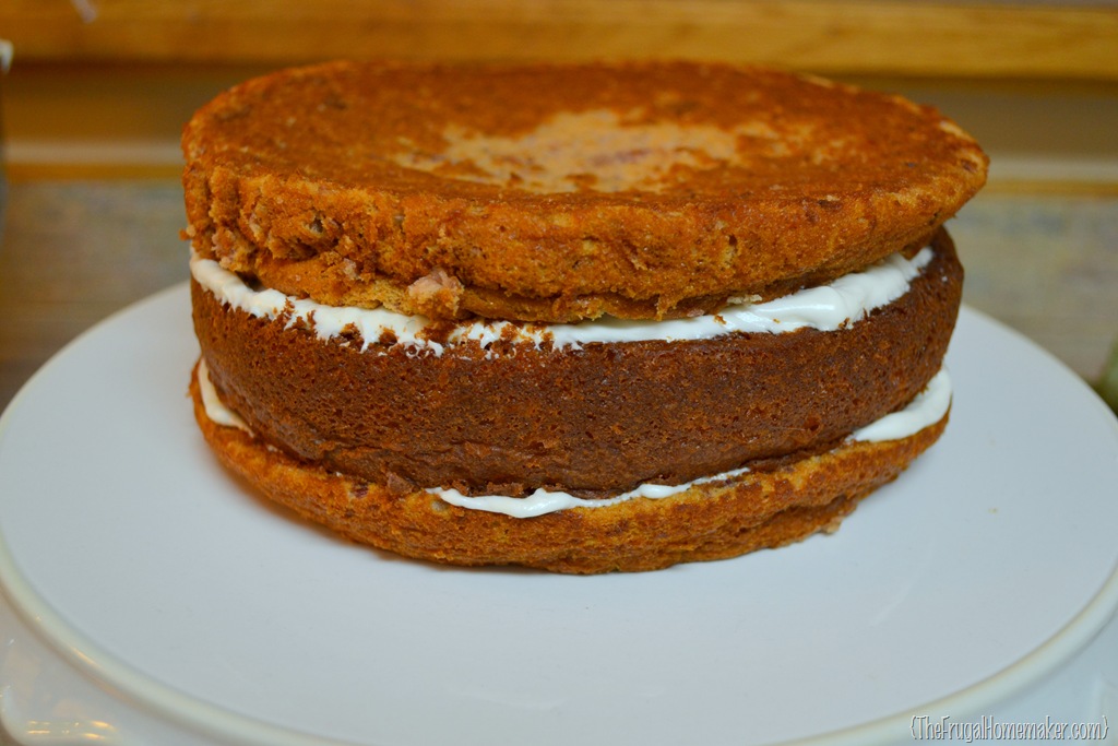 At this point,since we are working with cream cheese icing, if your icing is really soft or your cakes are sliding at all, put cake in refrigerator to cool and set for about 20 minutes.