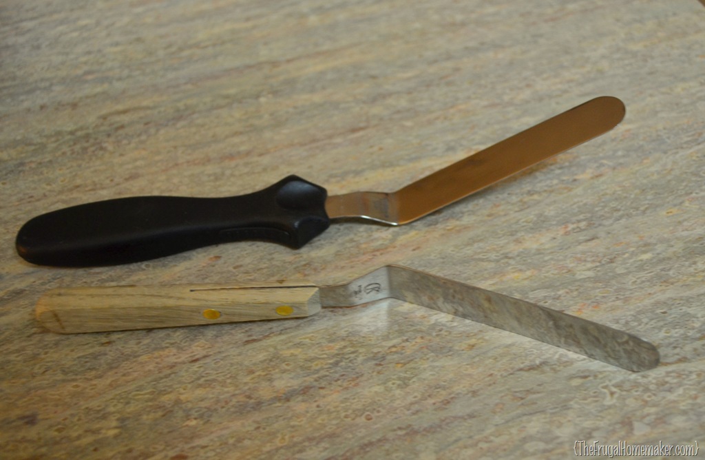 Oh, let me stop and tell you my favorite cake icing tool.  (And I use this for frosting brownies, spreading cream cheese on bagels, whatever.)  This is called an offset or angled spatula.  As you can see it is angled so that your hand and the handle stays above/away from what you are frosting.  Wonderful kitchen tool!
