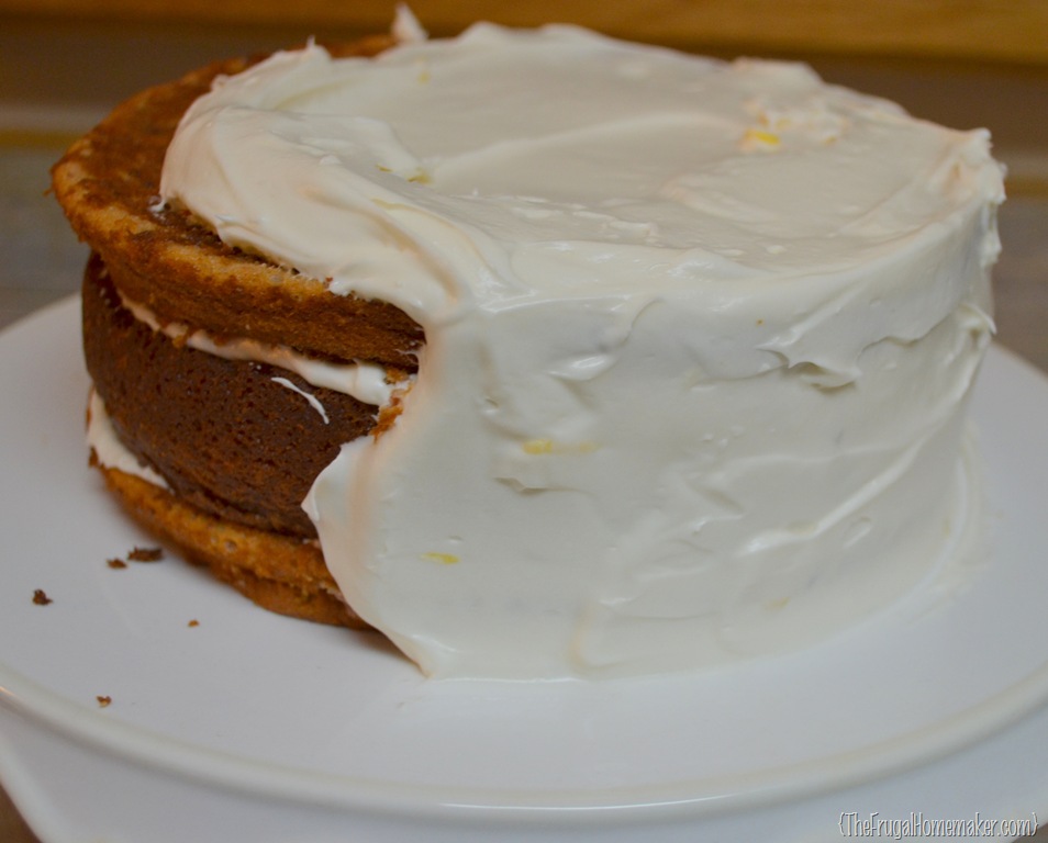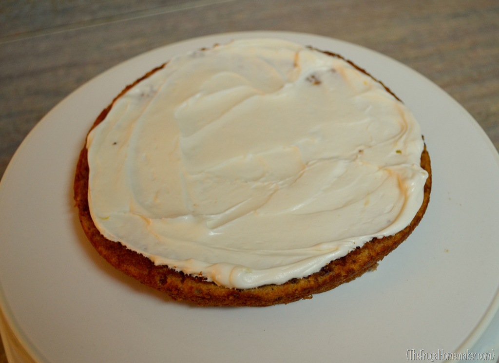 Since cream cheese icing is really soft and can get runny as it gets warm, this time you definitely need to put your cake in the refrigerator to set for 20-30 minutes.