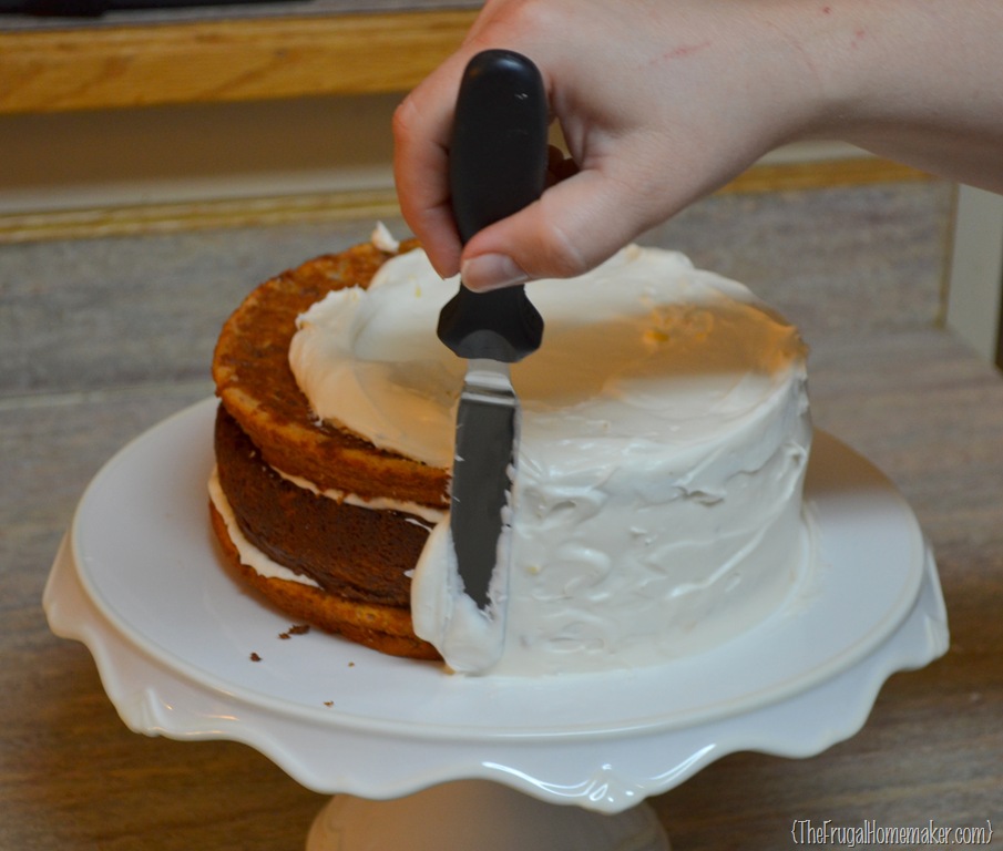 Now the smoothing begins.  Now when I am making a cake for just family dinner or a holiday, I don’t strive to get 100% perfectly smooth.  I just want it basically smooth.