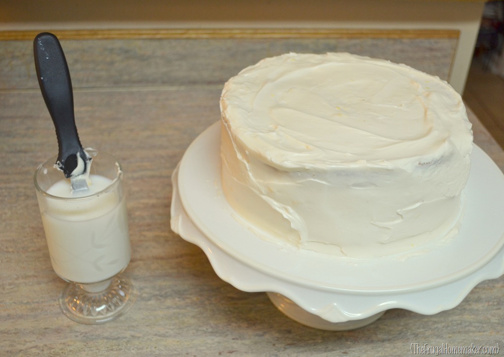 You will need a cup of water or milk.  Using your angled spatula again, dip it in the liquid and then smooth the sides of the cake, turning the cake as you smooth.  Keep dipping your spatula and then smoothing the cake.  You can even smooth from the bottom up if you are wanting to get a nice crisp edge on your top edge.