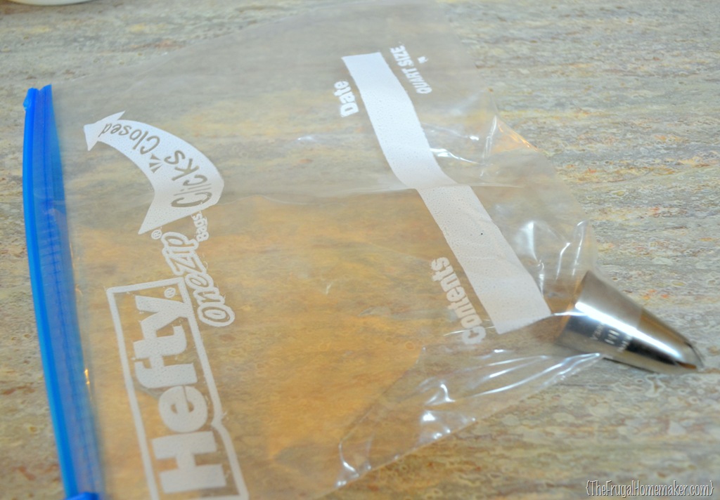Now this tip is of course meant to be used with a pastry icing bag which I usually use.  But you can just as easily use a FREEZER ziploc bag with the corner cut off as your icing bag if you wish.  Just make sure the tip fits snugly and won’t come out.