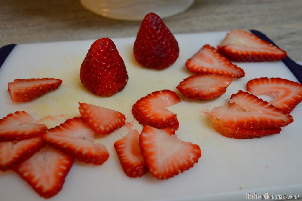 Since it is a strawberry cake we are going to add some fresh strawberries to the top.  Wash, stem, and slice 3-4 strawberries.  You will only want to use the middle “pretty” slices and you can dispose of the others however you choose.