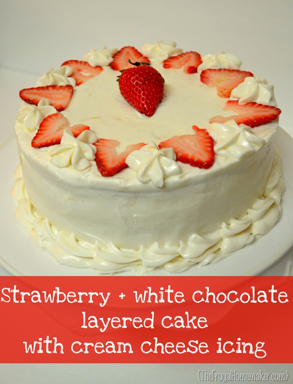 Mmm… I didn’t tell my husband what any of the flavors were and gave him 2 bites.  He definitely said it had cream cheese icing with a little lemon and thought the middle layer was a custard (guess that is close to white chocolate) and then of course tasted the strawberries.  It passed his taste test 🙂