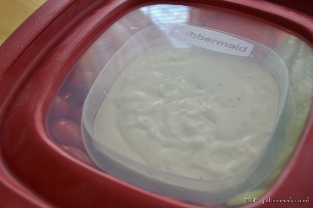 I saw this idea on the Rubbermaid site to use 2 containers (a smaller container inside a larger container) to make it like a chip ‘n dip container! Brilliant I tell you!