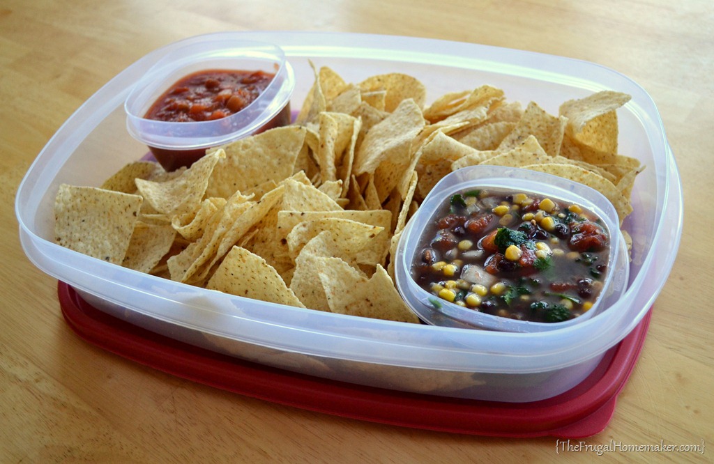 I used my other large container for chips. Two smaller containers will get added at the party filled with salsa – one container of regular hot salsa and another container of homemade black bean and corn salsa.