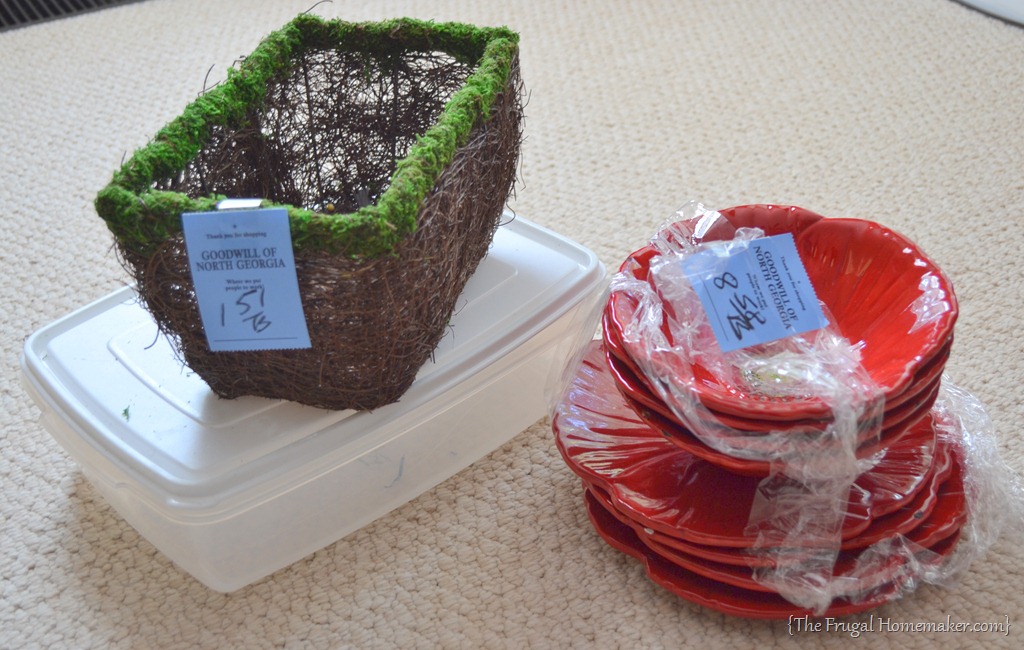 Goodwill – basket $1.51 (perfect for a spring arrangement), Rubbermaid tub – $1.01, and a set of 4 poppy plates and bowls for $8.58. I have been trying to pick up a few sets of 4-6 plates to use for tablescapes and this was a great deal!
