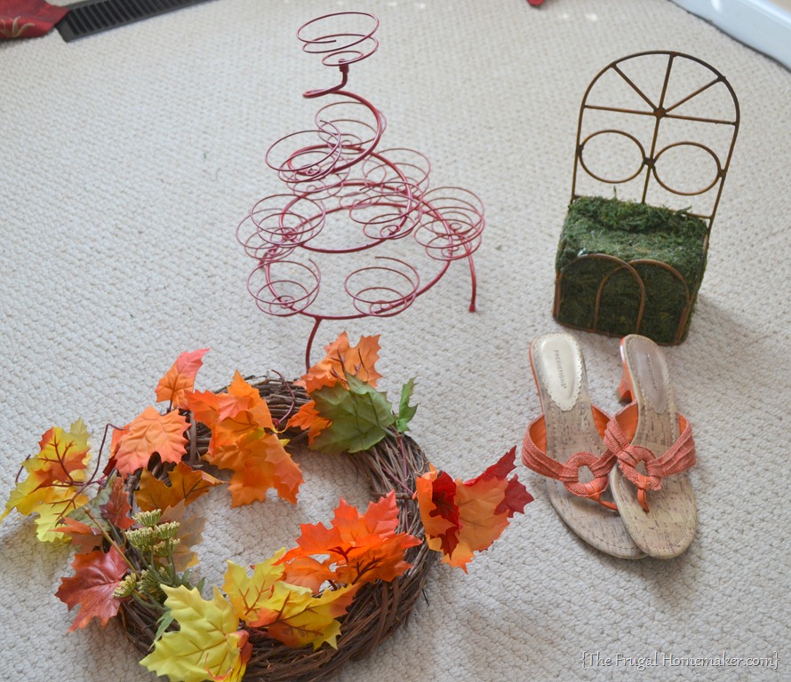 Here’s what I found at the yard sale. Cupcake stand – $1.00, sandals – $1.00, moss/rusted iron thing – $1.00, and fall wreath – FREE!