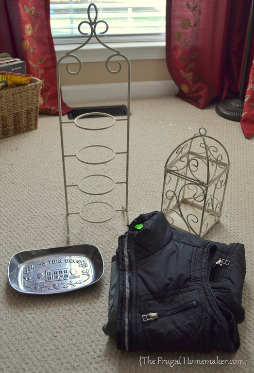Tiered stand – $1.00, birdcage/lantern thing – $1.00, silver platter – $1.50 (looked this up online – it is made by Armetale and it sells for $24.99 – might have to ebay it), vest – $2.49.
