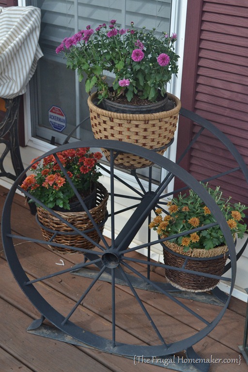 I also picked up 3 wicker pots/baskets for $0.50 each to put mums in to display in my wagon wheel planter that I found at a yard sale last week. I had stolen the ones from my mantel for my front porch when I took pictures of it, and then had to put them back – so I needed more.
