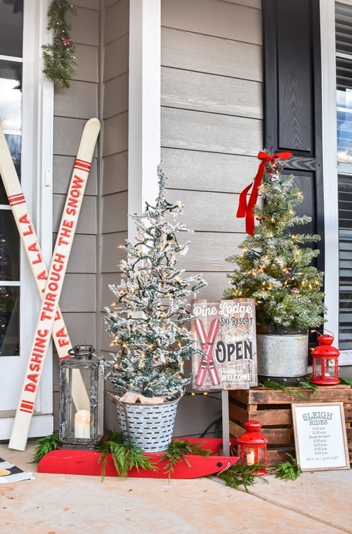 Wow! So many festive details in this porch- I love the ski lodge theme! The flocked trees look so great among the skis and sled!