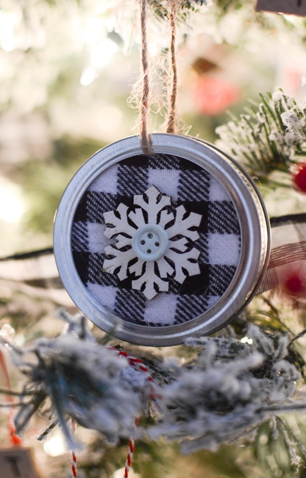 Save those used mason jar lids to make these fun DIY mason jar lid ornaments! I used scraps of the same fabric from the ball ornaments so you can get 2 uses out of it.