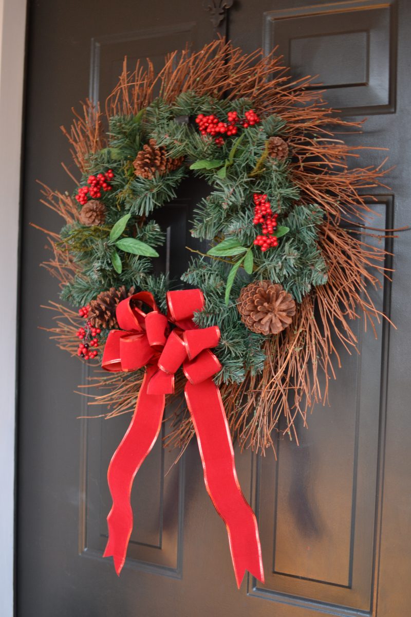 I made this years ago – but the tips to adding embellishments to a inexpensive evergreen wreath would work no matter what colors or design you wanted to do.