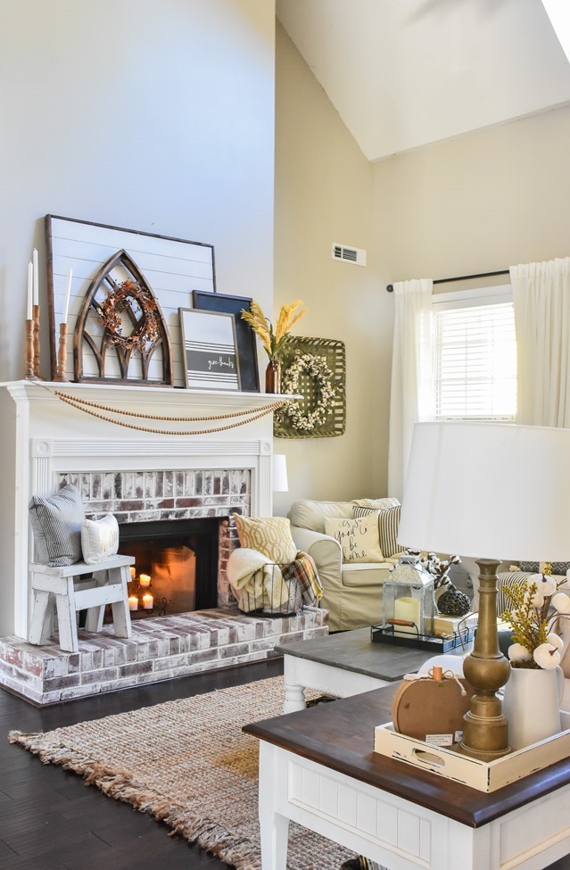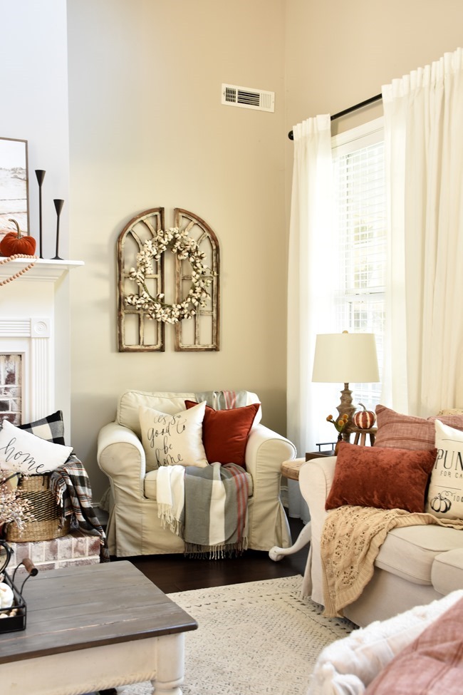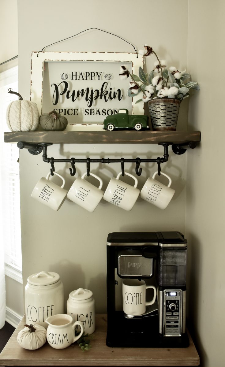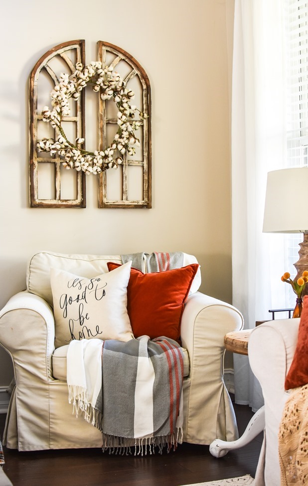 The year before I did a layered simple fall mantel with thrifted mirrors Neutral layered fall mantel Picket fence fall mantel This was my first fall mantel in our current home and it’s one of my favorites!  I love the simplicity and the symmetry AND it also got me published in a magazine!  You can see the magazine feature here. This was my last fall mantel at our previous home and the year I built those DIY wood shutters.  You can see how to make those and more about this mantel here. Fall mantel with layered chalkboard Fall mantel with old window This was the very first fall mantel I ever blogged… my style has changed since then but I still love that linen banner I made. I used some reclaimed pallet wood to make this mantel backdrop Fall wreath ideas: I love to make wreaths for the seasons and this DIY cotton wreath can be used year-round but especially works during fall. This was a simple fall wreath I made at our last house.  You can follow this same basic concept and do whatever colors and stems you prefer And this wreath is basically a free project and one that would be fun to do with your kids!  Just gather up some fall leaves and glue to a wreath form made from a cereal box or cardboard – full tutorial here. Did you ever make one of those coffee filter wreaths back in the day?  When I first started blogging they were everywhere and in every color!  So simple and cheap to make.   And for this fall wreath I basically gathered every stem and pick I had and put it on a wreath form  – fall overload on the front door! 🙂  I made this DIY wood slice wreath for Christmas but you could easily use for fall or all year round just by using different decor on it.   Fall living room ideas: My living room is probably my favorite area to add some fall touches just because it’s the room we spend the most time in and the center of our home.   I really liked the simple touches I used on my mantel last year with wood beads, amber jars and burnt yellow accents. Adding rich fall colors in pillows and throws adds so much to your home.  Many of these pillows and throws I have thrifted over the years just making sure to wash really well. I have made several DIY chalkboards and it is a fun spot to decorate for fall too. Cozy is my favorite way to decorate for fall! You can keep it more neutral or add more vibrant fall colors.   Fall front porch ideas: My other favorite spot to decorate is my front porch!  We have a long yet narrow front porch in this house with a centered front door and it’s a lot of fun to decorate!   I have some old picket fence pieces I use out there many times. This particular year I did sort of a fall farmer’s market theme on my front porch. My porch swing gets lots of use and it’s such a fun spot to add some fall touches too. Last year I added hay bales to my front porch for the first time just for something different.  Do you do hay bales or corn stalks or mums or pumpkins?   Again using those old picket fence pieces along with hay bales, mums and pumpkins.  I have collected over time many faux pumpkins from yard sales, clearance sales and Walmart usually has some budget-friendly ones too so that I don’t have to buy real pumpkins every year. It can get expensive buying it all so I have found ways to cut down the cost.  I also will plant any mums I get in my yard and most of them will come back year after year giving me more return for my money 🙂 This was my first fall front porch in our house but still one of my favorites!  I love using potted grasses in my fall decor and I may do that again this year.  Buy some for your fall porch and then plant them in your yard after the season! And this year I went all out with lots of picket fence pieces on my fall front porch and some mums I found on clearance! An old wood chair is a fun way to style a pot of mums on your porch.   Fall Coffee bar   I love changing up my coffee bar for the seasons and here’s one fall coffee bar I did.  You can see all the details on how I created my coffee bar here. Fall tablescape ideas I don’t usually host Thanksgiving at my house but that doesn’t stop me from creating a pretty fall table.  This one was simple with some pretty fall dishes and a DIY centerpiece box. Last year I did a pretty Thanksgiving table in my dining room – see all the details here.   And this fall table at my previous home was one of my favorites! 0Fall table Fall project/craft ideas: I’ve done quite a few fall projects and crafts over the years – one of my favorites has to be these DIY wood pumpkins.  Make them with or without the added planter boxes on the front. I also painted these premade wood pumpkins one year too.   Did you know that you can paint pumpkins?  One year I used regular latex paint and did some fun painted designs on pumpkins.   A DIY painted sign is a great way to add some fall decor to your porch.  Find the template to make this exact sign in this post. And did you know you can create your own mercury glass?  Such a fun and cheap way to make a pretty glass pumpkin.   I made this pumpkin topiary after loving one that my MIL had from a store.  Much cheaper to DIY yourself! DIY Pumpkin topiary And last fall we built a DIY stone firepit in our back yard and have enjoyed it all year! Much easier project than you think so definitely check out this post.  I hope this helps you get some ideas for your fall decor this year!  Whether it be something you can make or create or some color schemes or decor ideas.  I’d love to know what your favorite fall decor post was or hear what you plan on doing to decorate for fall this year? Also, I am joining up with some of my blog friends and doing a monthly blog hop called “It’s so good to be home!”  I hope you’ll hop over and check out their posts today too  – I see some more really good fall inspiration.