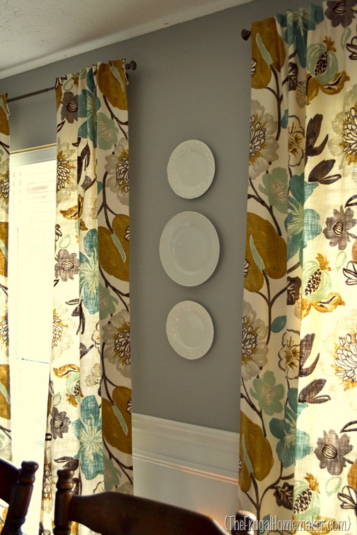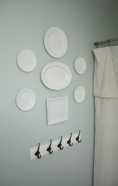 One of the little changes I had been wanting to make was to put something on the wall in between the two curtains. In fact, I knew what I wanted – I wanted plates! Preferably white plates maybe with a fun design or a square plate in the middle.