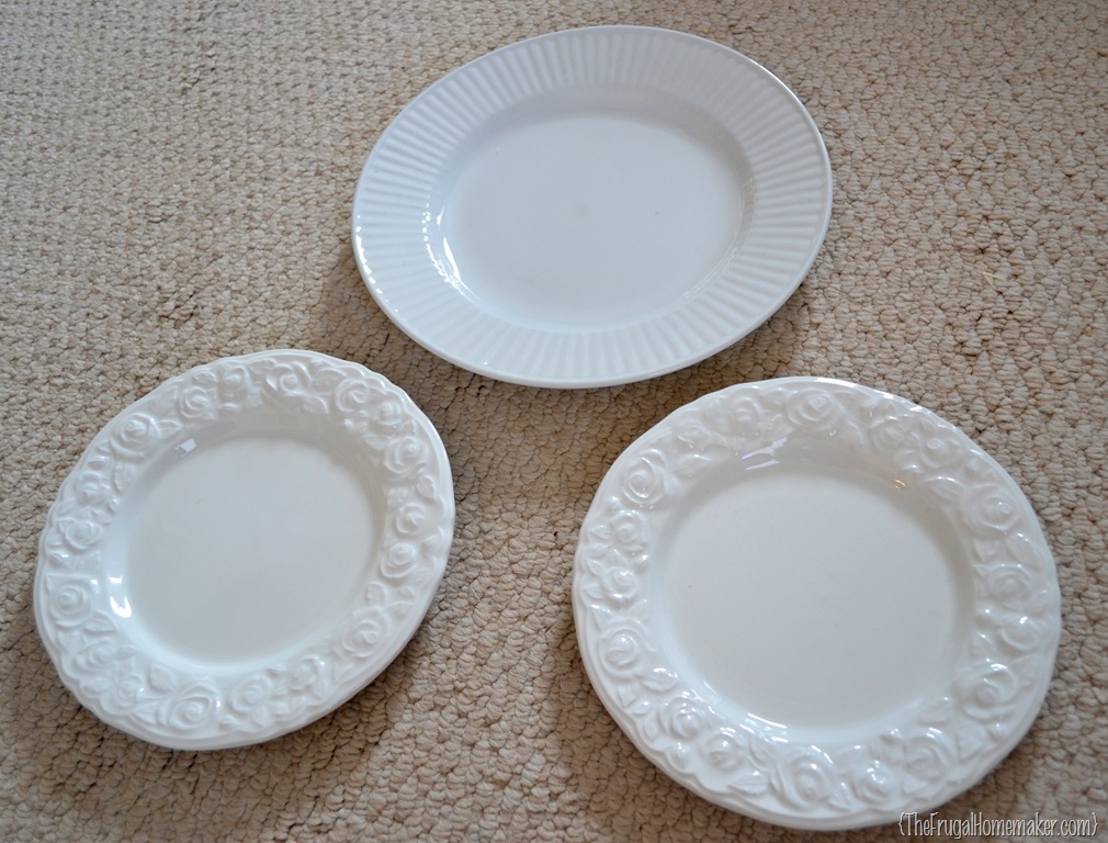 And then enter these plates I found at Value Village. The smaller floral pattern plates were $0.80 each and the larger ridged plate was $1.21. So $2.81 total. Under $3, my type of project, just like my $3.00 green spring wreath.