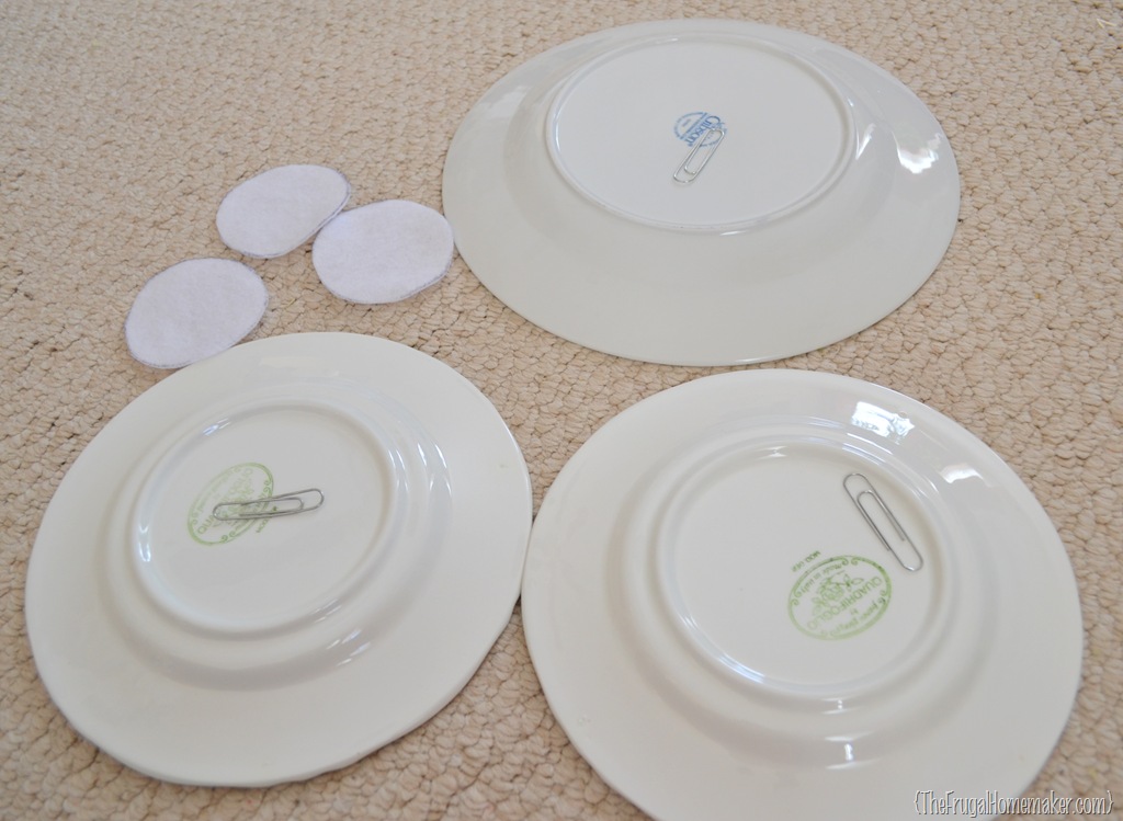 And here are all 3 plates done. On the smaller plates I was able to glue more of the paper clip under the felt so only a small little circle is sticking out. And let me tell you, those paperclips and felt circles are not going anywhere! I tugged and pulled and yanked and they were firm as can be.