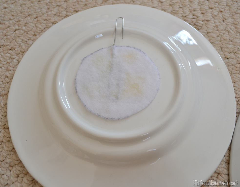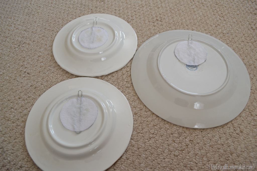 I asked Laine if she had used anything on the back besides the paperclip and she said no. I thought maybe some felt would help secure it to the plate, protect the wall, and give some added protection. She agreed. So I cut out some felt circles from some felt scraps I had, bent 3 large paper clips to be hangers, and glued them all on with lots and lots of hot glue! 🙂