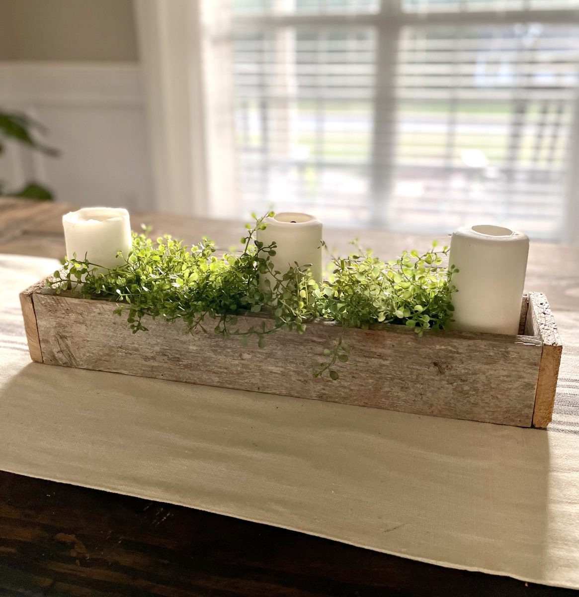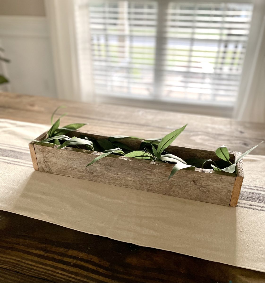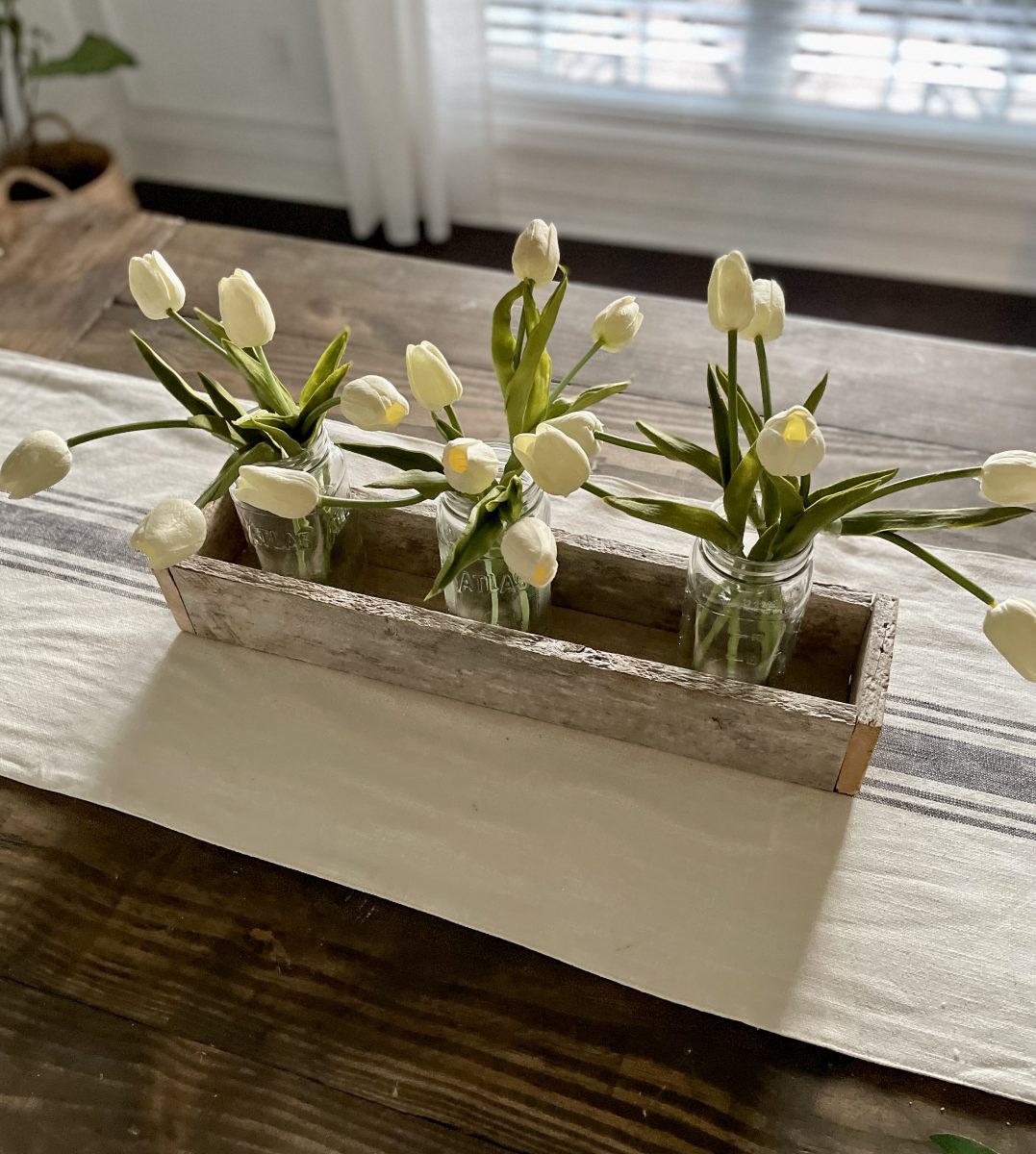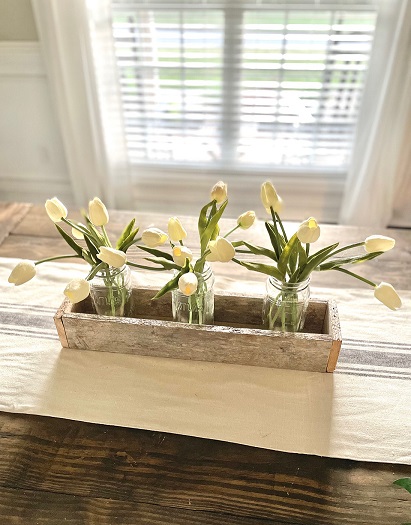 With my nephew’s recent interest in building and something that I have wanted to share since I began building, I thought it would be the perfect timing to do a DIY series on simple builds.  If you are new to building things, new to using tools, young/old, and just wanting to learn how to build basic things and learn some basic building skills this series is for you!  Maybe you are very familiar with tools and building… these projects would be a great way to teach your kids or another friend how to build.   So today let’s start with a simple build that also doubles as some fun home decor – a DIY centerpiece box.   You could technically build this with just a saw (a circular saw, jigsaw, or miter saw) and nails and a hammer or even just wood glue… but I did use a saw and a nail gun along with some wood glue. The other awesome thing about this box is it is very easy to customize to the size you want for your home or for maybe wood scraps you have one hand.   You will just need 3 boards that are the same length and then boards cut to fit the end of your box once it is assembled.   I recommend using a 1x board for this (meaning it is 1 inch thick or actual measurements is 3/4 thick) – so a 1×4 inch board would be the same dimensions like my box or 1×6 inch board would be taller than my box. I will give you my exact dimensions but again you can truly easily make this any size you want.   Our box is 21 inches long, 4.5 inches wide, and 3.25 inches tall.   We are using some reclaimed barn wood that my nephew had on hand that measures 3 1/4 inches wide so basically like a 1×4 board.  We cut the 3 long boards at 20 inches and once we assembled the box the end boards needed to be 4.5 inches long.  Again these end pieces are best cut and measured once you assemble the first 3 boards so you can get an exact measurement.   Start by assembling the 3 longer boards into a U or trough sort of shape.  Again I have and love to use my Ryobi nail gun but if you wanted to use some small finishing nails and a hammer you could or you could just use wood glue and clamp or prop this up until it dried and then do the next step  Here’s how it will look. 2 sides and the bottom – all 3 are the exact same size.   Then you will want to measure from the outside of the board on one side to the outside of the board on the other side to get your exact measurement for your end board.  Ours ended up being 4.5 inches exactly.   Again we used wood glue and just 5 small 1-inch nails in my nail gun to nail the ends on.   Here’s the finished box!  Now at this point, if you are using off-the-shelf lumber, you will want to lightly sand it and then finish it however you want.  Stain it, paint it, or stain then paint and distress.  Since this is naturally aged barn wood that already has a beautiful rustic look to it we are leaving ours just like this.   Now you may ask how or where would I use this?  So many possibilities! This is just a $3 green olive leaf garland from the Target dollar spot that I put inside and you could just do this or add a second one to make it more full… or go another step and add some candles. Or here it is styled with just some greenery picks in it.    I see many people that have TV’s over their mantel struggle with wanting to still have some decor that won’t block the TV.  Depending on how high your TV is from the mantel, something like this would work perfectly!   Plus you can decorate for all seasons by adding some fall picks or garland in it for fall and Christmas greens in it for Christmas. Or line the box with some heavy plastic or buy a plastic plant insert and plant real flowers or herbs in it and use it as a centerpiece box on your outdoor table!  I just may have to do this with one of these boxes! 🙂 Could also add candles in it with some seasonal picks or greenery. Just be careful to not burn candles unattended with the wood or make sure to have the candles in glass jars or cylinders. I honestly think I may love this look the best – maybe because it’s spring or I just love these faux tulips that look so real.  I used some leftover glass jars from spaghetti sauce (my box is just a tad too narrow to fit a large quart size mason jar in it but would be fine for a pint-size jar). I love this simple look but you could also add moss or candles in between. Or do fresh flowers in the jars.  These would make great wedding or event centerpieces or decor too because they are simple and inexpensive to make. This box could be made to go along the length of your table too – making an extra-long box to fill with seasonal decor – would be beautiful for fall and Christmas!  Or make it a tad shorter, fill with smaller pint mason jars and use it as a silverware caddy for all the upcoming summer gatherings.  I keep thinking of more ways to use it, I may need to build some more! 🙂 What’s your favorite way to use it?   Where would you use one of these?  And be honest, if you have never built something before does this seem like something you could do, and are you going to try it?  If you do, PLEASE send me an email or message me on social media – I’d love to see it! My 10-year-old nephew and I built 5 of these in about an hour after we had done the first one and gotten our measurements down.  He did most of the work – even using my miter saw with supervision and nail gun as I held the boards for him.  Totally doable for a pre-teen or teen to do or a beginner builder!  He is just learning how to use a circular saw and power tools.   I am joining up with some other blog friends as they share their projects too.  Make sure to click on the links below to check out their posts.