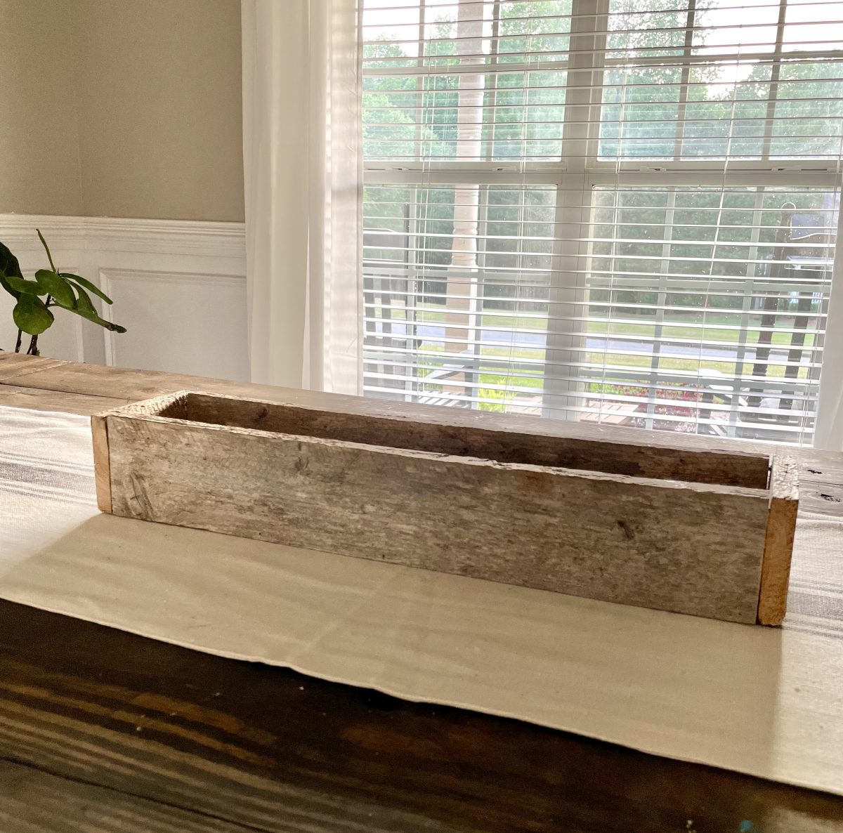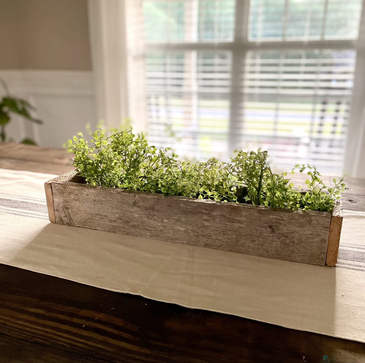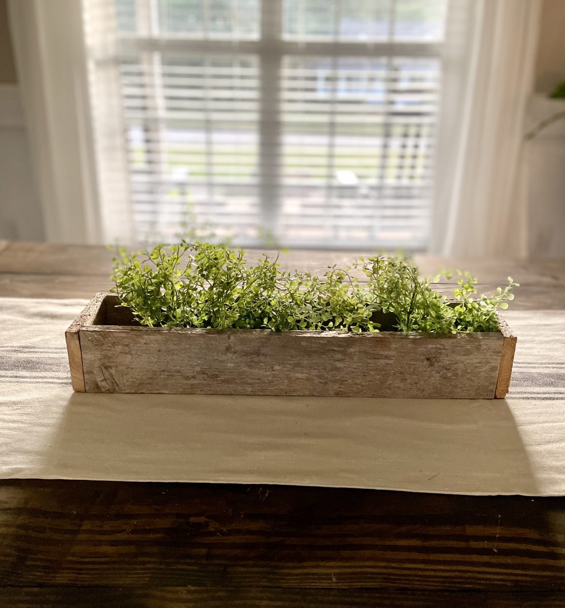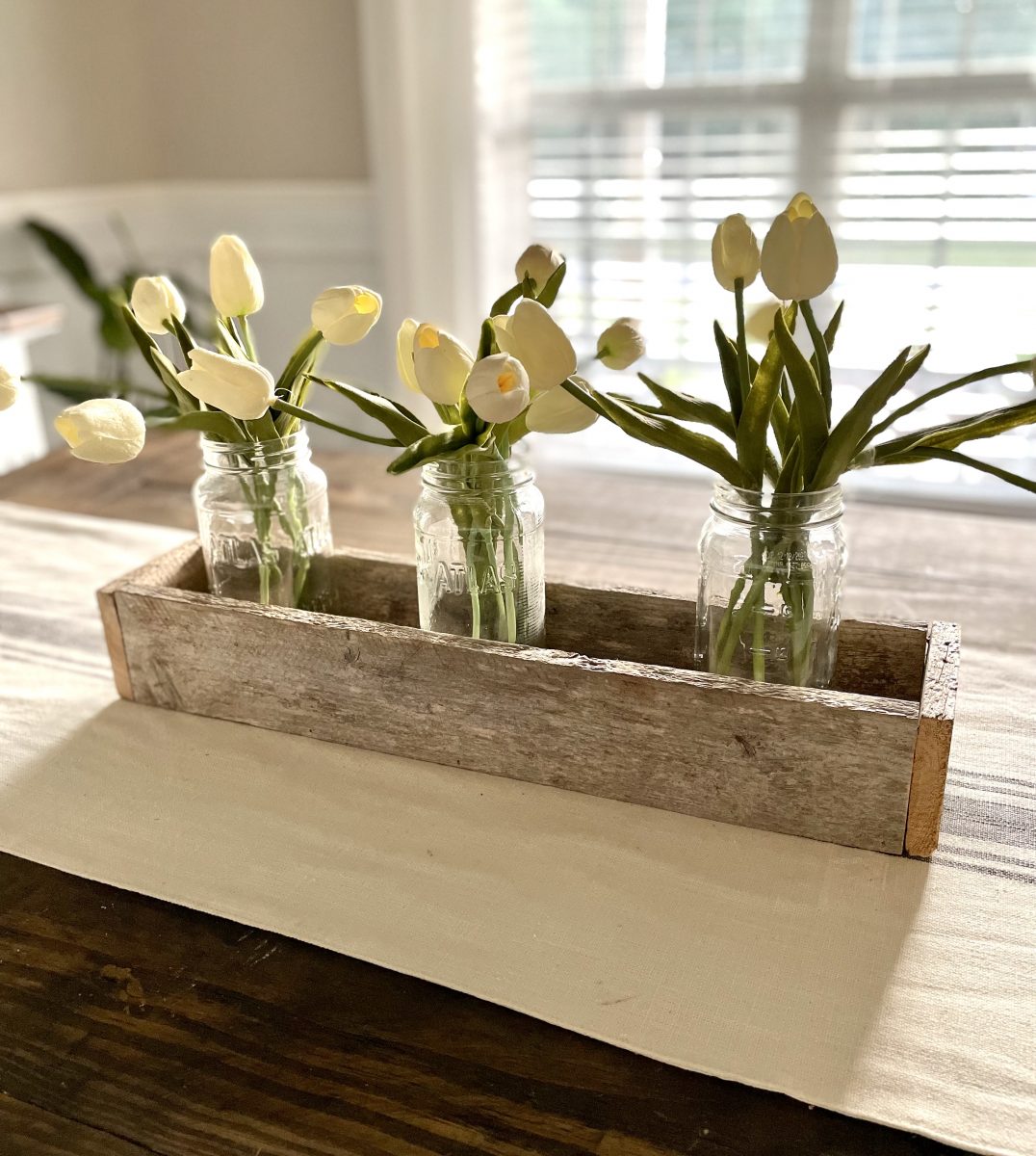 With my nephew’s recent interest in building and something that I have wanted to share since I began building, I thought it would be the perfect timing to do a DIY series on simple builds.  If you are new to building things, new to using tools, young/old, and just wanting to learn how to build basic things and learn some basic building skills this series is for you!  Maybe you are very familiar with tools and building… these projects would be a great way to teach your kids or another friend how to build.   So today let’s start with a simple build that also doubles as some fun home decor – a DIY centerpiece box.   You could technically build this with just a saw (a circular saw, jigsaw, or miter saw) and nails and a hammer or even just wood glue… but I did use a saw and a nail gun along with some wood glue. The other awesome thing about this box is it is very easy to customize to the size you want for your home or for maybe wood scraps you have one hand.   You will just need 3 boards that are the same length and then boards cut to fit the end of your box once it is assembled.   I recommend using a 1x board for this (meaning it is 1 inch thick or actual measurements is 3/4 thick) – so a 1×4 inch board would be the same dimensions like my box or 1×6 inch board would be taller than my box. I will give you my exact dimensions but again you can truly easily make this any size you want.   Our box is 21 inches long, 4.5 inches wide, and 3.25 inches tall.   We are using some reclaimed barn wood that my nephew had on hand that measures 3 1/4 inches wide so basically like a 1×4 board.  We cut the 3 long boards at 20 inches and once we assembled the box the end boards needed to be 4.5 inches long.  Again these end pieces are best cut and measured once you assemble the first 3 boards so you can get an exact measurement.   Start by assembling the 3 longer boards into a U or trough sort of shape.  Again I have and love to use my Ryobi nail gun but if you wanted to use some small finishing nails and a hammer you could or you could just use wood glue and clamp or prop this up until it dried and then do the next step  Here’s how it will look. 2 sides and the bottom – all 3 are the exact same size.   Then you will want to measure from the outside of the board on one side to the outside of the board on the other side to get your exact measurement for your end board.  Ours ended up being 4.5 inches exactly.   Again we used wood glue and just 5 small 1-inch nails in my nail gun to nail the ends on.   Here’s the finished box!  Now at this point, if you are using off-the-shelf lumber, you will want to lightly sand it and then finish it however you want.  Stain it, paint it, or stain then paint and distress.  Since this is naturally aged barn wood that already has a beautiful rustic look to it we are leaving ours just like this.   Now you may ask how or where would I use this?  So many possibilities! This is just a $3 green olive leaf garland from the Target dollar spot that I put inside and you could just do this or add a second one to make it more full… or go another step and add some candles. Or here it is styled with just some greenery picks in it.    I see many people that have TV’s over their mantel struggle with wanting to still have some decor that won’t block the TV.  Depending on how high your TV is from the mantel, something like this would work perfectly!   Plus you can decorate for all seasons by adding some fall picks or garland in it for fall and Christmas greens in it for Christmas. Or line the box with some heavy plastic or buy a plastic plant insert and plant real flowers or herbs in it and use it as a centerpiece box on your outdoor table!  I just may have to do this with one of these boxes! 🙂 Could also add candles in it with some seasonal picks or greenery. Just be careful to not burn candles unattended with the wood or make sure to have the candles in glass jars or cylinders. I honestly think I may love this look the best – maybe because it’s spring or I just love these faux tulips that look so real.  I used some leftover glass jars from spaghetti sauce (my box is just a tad too narrow to fit a large quart size mason jar in it but would be fine for a pint-size jar). I love this simple look but you could also add moss or candles in between. Or do fresh flowers in the jars.  These would make great wedding or event centerpieces or decor too because they are simple and inexpensive to make. This box could be made to go along the length of your table too – making an extra-long box to fill with seasonal decor – would be beautiful for fall and Christmas!  Or make it a tad shorter, fill with smaller pint mason jars and use it as a silverware caddy for all the upcoming summer gatherings.  I keep thinking of more ways to use it, I may need to build some more! 🙂 What’s your favorite way to use it?   Where would you use one of these?  And be honest, if you have never built something before does this seem like something you could do, and are you going to try it?  If you do, PLEASE send me an email or message me on social media – I’d love to see it! My 10-year-old nephew and I built 5 of these in about an hour after we had done the first one and gotten our measurements down.  He did most of the work – even using my miter saw with supervision and nail gun as I held the boards for him.  Totally doable for a pre-teen or teen to do or a beginner builder!  He is just learning how to use a circular saw and power tools.   I am joining up with some other blog friends as they share their projects too.  Make sure to click on the links below to check out their posts.