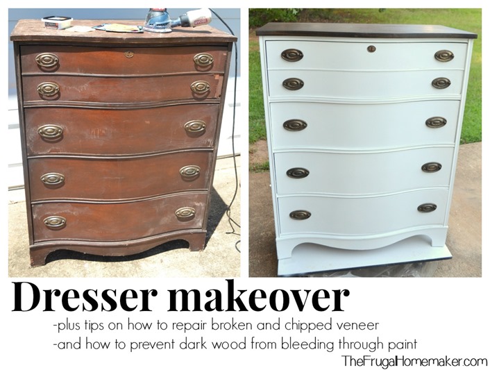 • Dresser makeover (how to fix chipped veneer + deal with wood stain bleeding through paint)