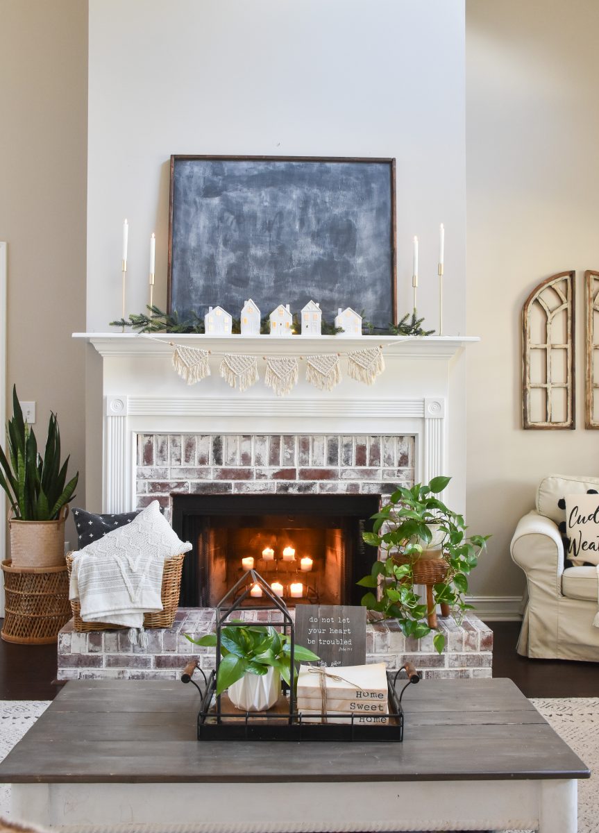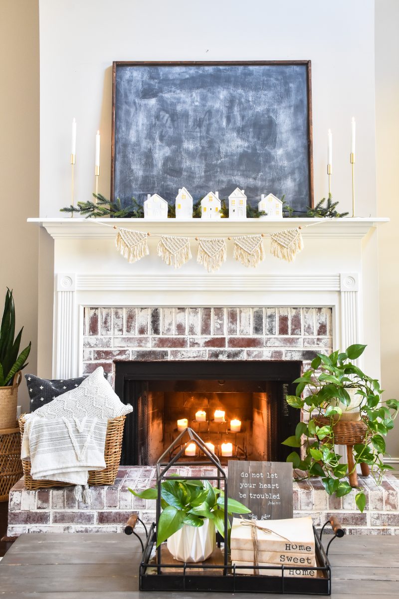 Actually, I just removed things from my Christmas mantel and simplified it a bit for winter. We can still enjoy the candlelight and lit-up houses during the dark dreary winter days. I got these flameless taper candles before Christmas and I just love them! Battery operated, on a timer, and have a remote – so nice to have them automatically come on each evening.