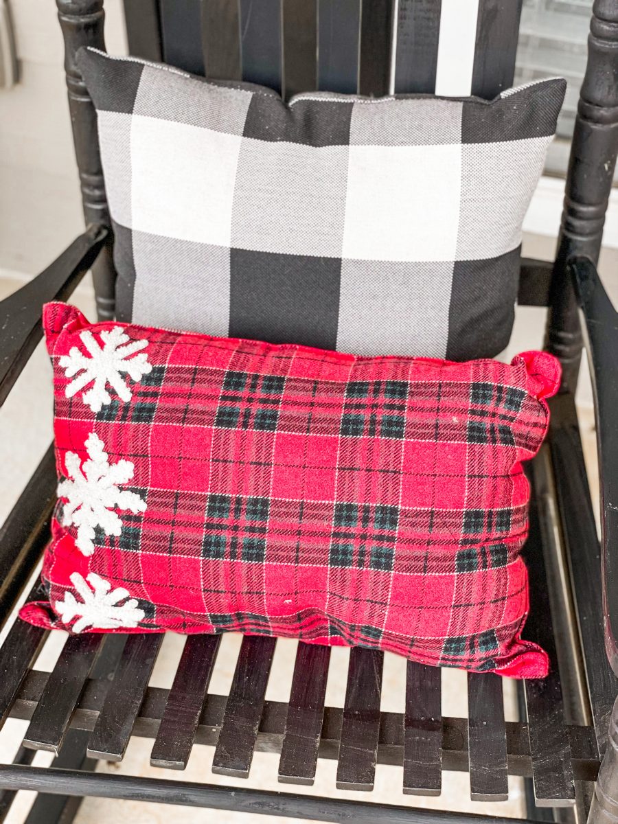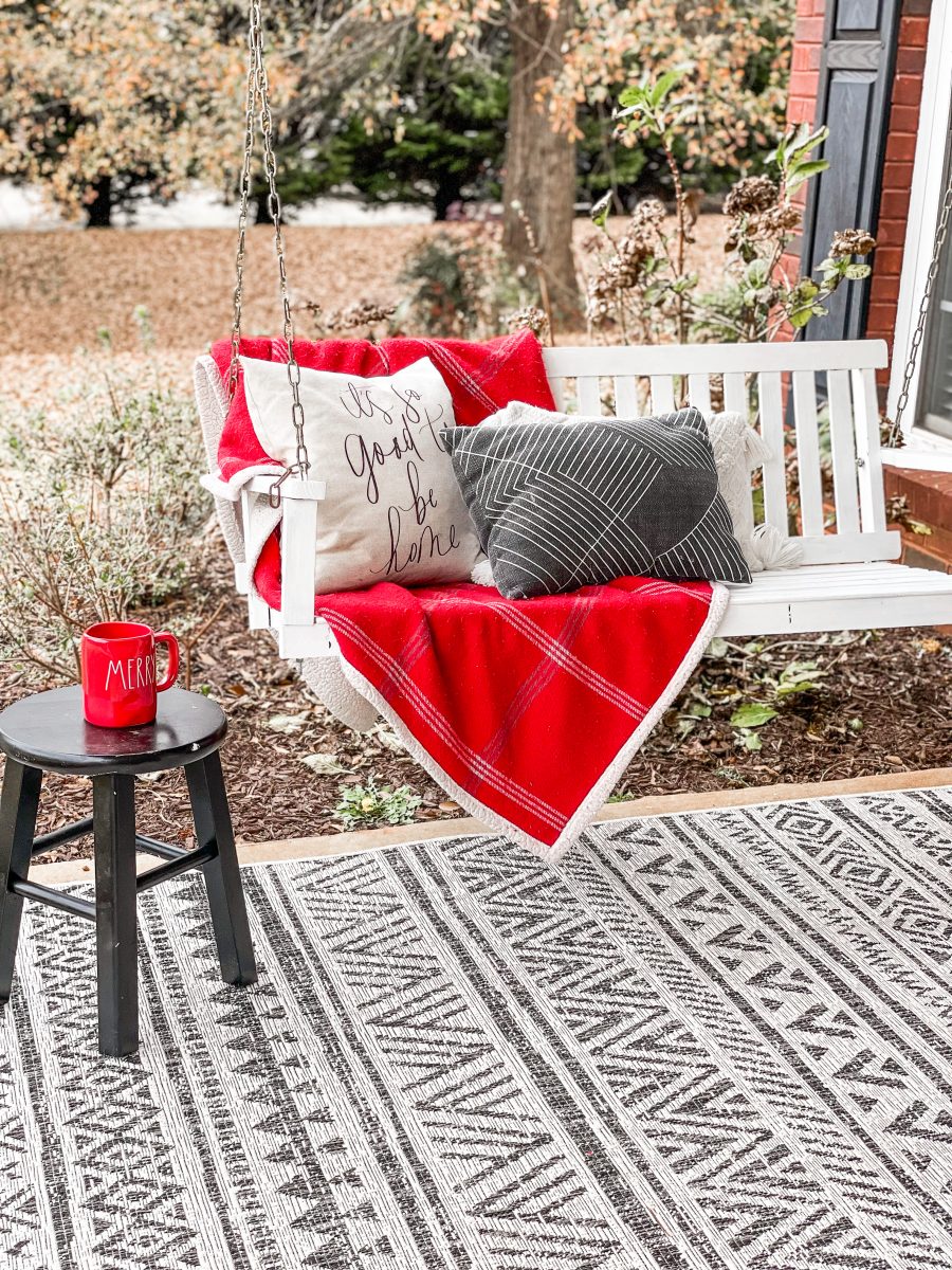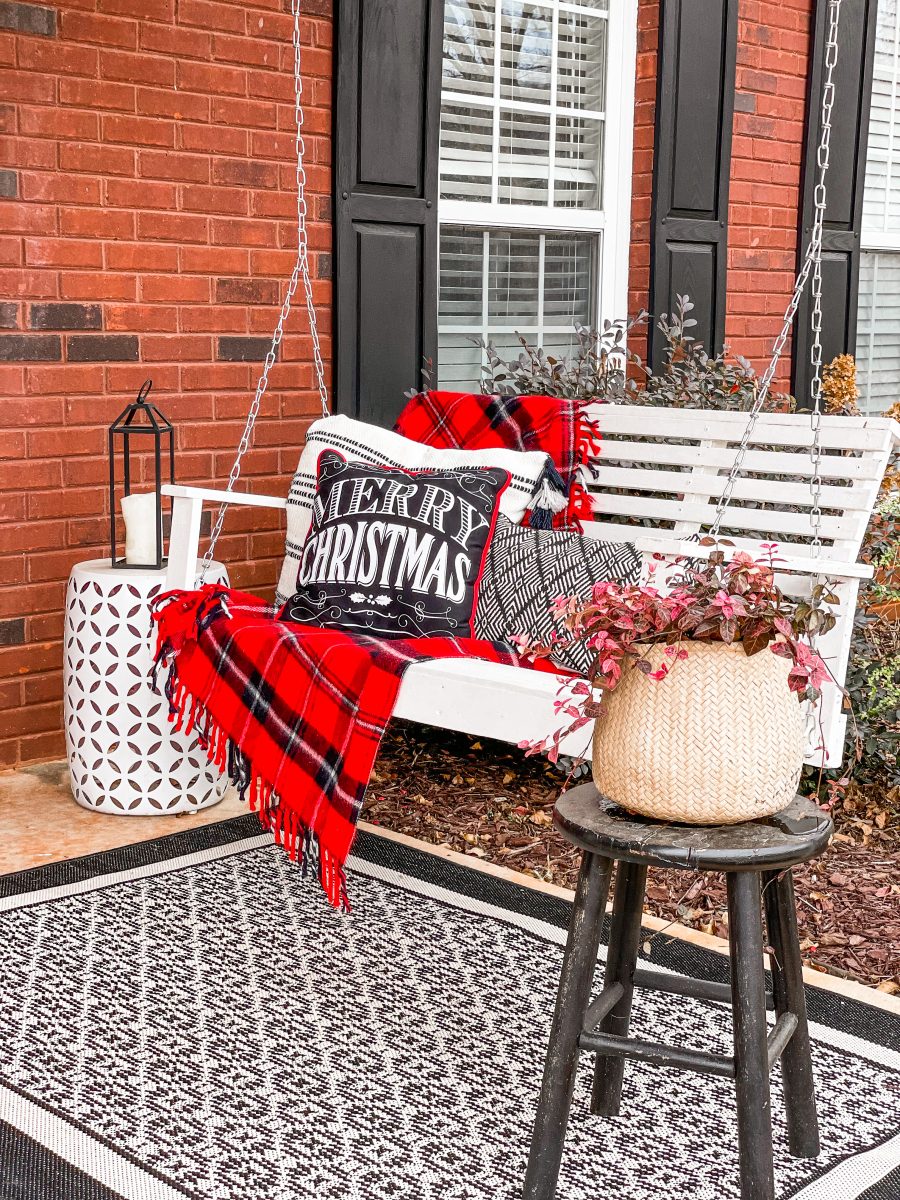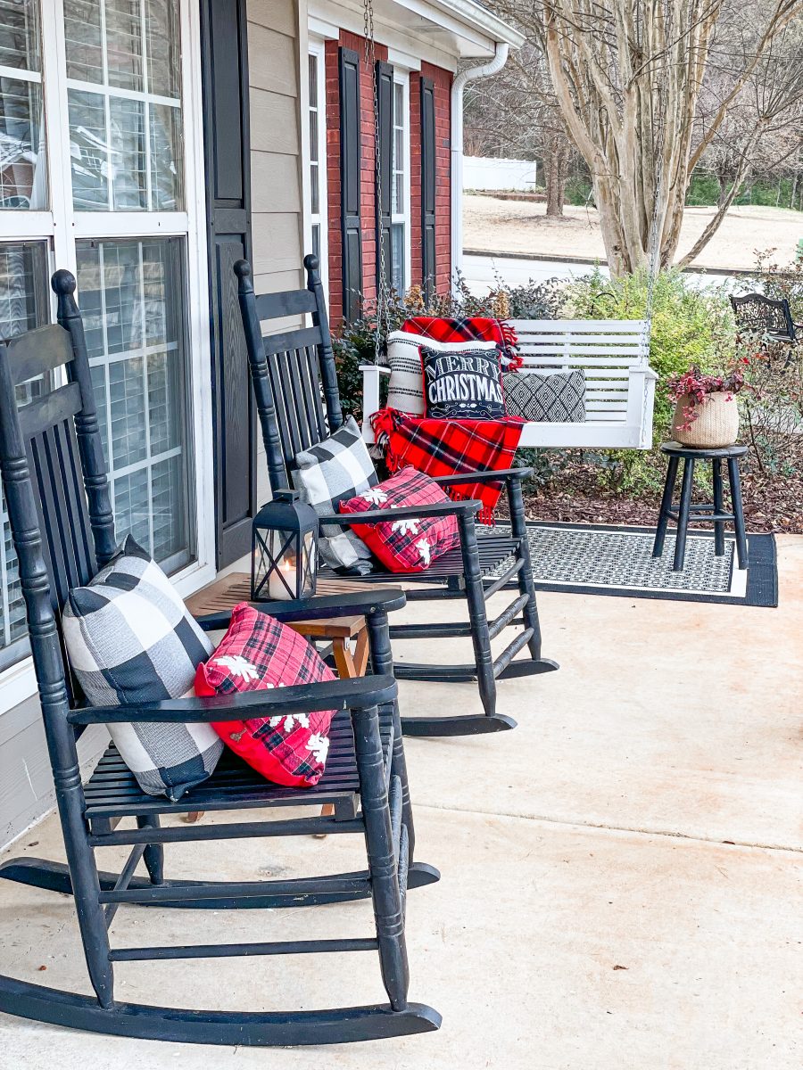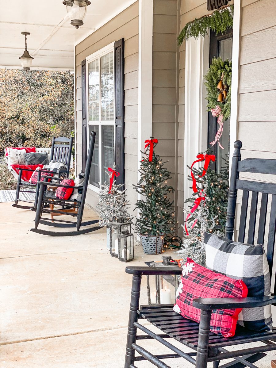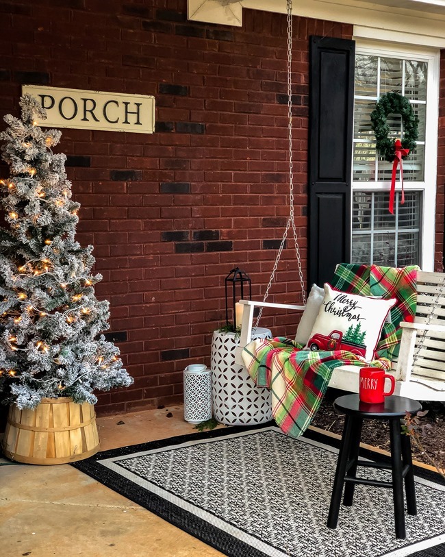 I do add a strand of lights on them.   This year I did change up my wreath and garland.  I found the prettiest realistic cedar garland and cedar wreath this year at Walmart that are actually budget-friendly!    That garland has been so extremely popular and it looks and feels so real without the mess of real greenery. Now for the rest of the porch… I have a long narrow symmetrical porch with 2 rocking chairs and a porch swing on each side. I leave these black and white buffalo check pillows (linking the pillow covers here) out all year and just added these placemat pillows I made 4-5 years with them.   I love to decorate my porch swing areas and since our winters are very mild here in the south we actually get to enjoy this spot even through December.   I found another porch swing this summer at a yard sale so now I have 2 swings on either side of the porch and just love to come out here and enjoy my coffee. I think I have used these lanterns on every porch (and even throughout the year!).  For pictures, I usually use real candles in them but can’t leave them out because we get 75 degree days sometimes in December so I will change them out for outdoor battery-operated timer candles that come on each night with the lights.   You don’t have to buy new decor each year or even have a ton of decor to decorate your front door or front porch area.  Buy some quality items once and you’ll be set and can just change ribbon colors, add some faux wrapped packages, add a sign to change it up each year.  A set of trees, a garland, a wreath, lanterns, and some decor like a sign or pillows – I’ll link the ones I used plus some other ones below.     I do a lot of my holiday shopping online so I like to leave some treats out for our delivery people that work so hard this time of year.  I created this free printable so you could print it too and leave some treats for your delivery drivers.  You can print it here. Here’s a few pictures at night (I need to try to grab some at dusk when it isn’t pitch dark)  – simple yet festive!  We don’t go all out and put lights on the house – we tried that one year and one week later they were already burned or shorted out and it’s just a lot of work!  But we do enjoy everyone else’s house with lights and try to just create a festive look on the porch.   I hope you enjoyed this Christmas front porch tour and got inspired for some ideas you can do on yours! I am joining up with some friends who are also sharing Christmas inspiration so I hope you’ll click over and see their posts and ideas too!