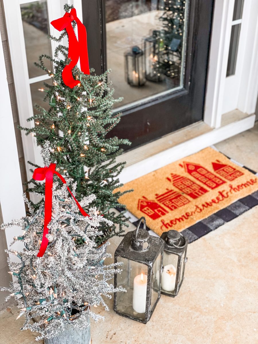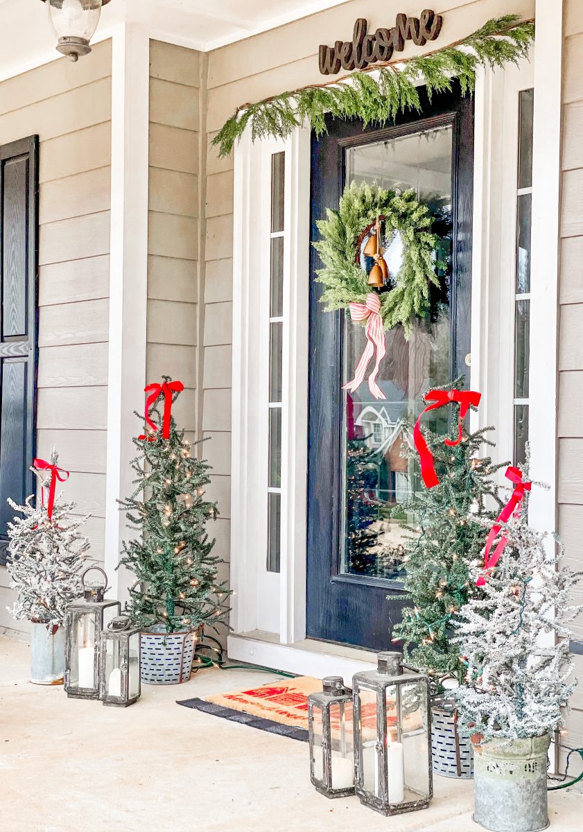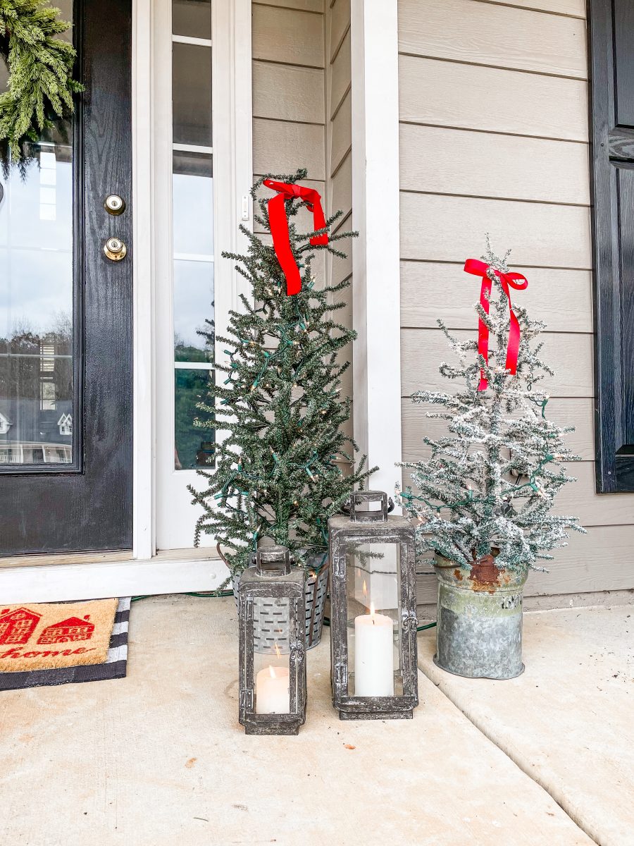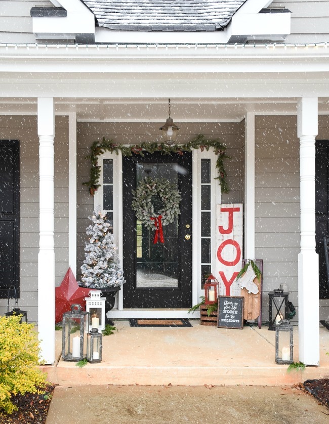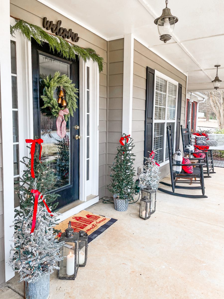 Welcome to my simple festive Christmas front porch!  I love decorating my front porch for the seasons and this year I went a bit simpler and created a simple festive Christmas theme.  Before I show you all of this year’s porch I thought it would be fun to go back and see the last 5 years of porches.  I hope it will inspire you that you don’t have to have all new decor each year and can use the same basic 5 things – garland, wreath, trees, lanterns, decor  – and rearrange them a bit to create a fresh look each year.   Our first Christmas in this house I did just a classic Farmhouse simple Christmas porch.  I was so excited to have a centered front door and be able to decorate with a lit tree on each side.  The presents are just empty boxes wrapped up with a simple bow.  Free decor!  I do suggest putting a rock or something in each box or if you get wind in our area you may end up with your faux presents in your neighbor’s yard. You can see more details on this porch here. The next year we got a short 2-hour snowfall in early December and I was ecstatic to photograph my Christmas front porch with snow falling!  Here in the South, it’s rare for us to get even one snowfall during the winter and it’s usually after Christmas so to have snow before Christmas with Christmas decor up was a bit magical. That year I used a larger flocked tree (this $30 one from Walmart) and a vintage sled and DIY JOY sign to decorate my porch.   The next year I had picked up a bunch of picket fence pieces for free off marketplace and enjoyed using them in my holiday displays creating a Farmhouse style Christmas Front Porch with picket fences.  They create a fun backdrop to decorate and since my porch is long and narrow they work well.   These fun little NOEL letters were fun to display on a ladder (they are just paper mache letters spray painted red.)   The next year I did a ski lodge theme for my porch and living room decor.  I had found that large vintage wood sled and those skis at a yard sale earlier that year and they were fun to incorporate into my Christmas decor with lots of trees and greenery.      Last year I did a classic cozy Christmas theme – incorporating dried orange slices and just classic Christmas decor.     I did use that same $30 6 foot flocked tree on the side of my porch and it was so pretty by my porch swing.     Now back to this year’s front porch!  Did you see many of the same things repeated?  I have used much of the same decor each year like the lanterns, trees, wreath on the door, garland, etc. and just rearrange it or change it up a bit each year.  I wanted just a festive simple look this year so I used the same 3 and 4 foot trees I have used many times before – I love these little trees and they are so budget-friendly.  I use them inside and outside my house in various places.  I will link them all below.