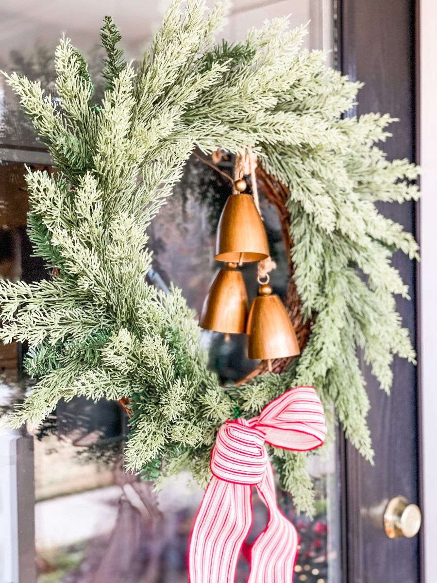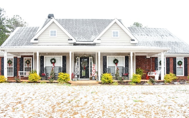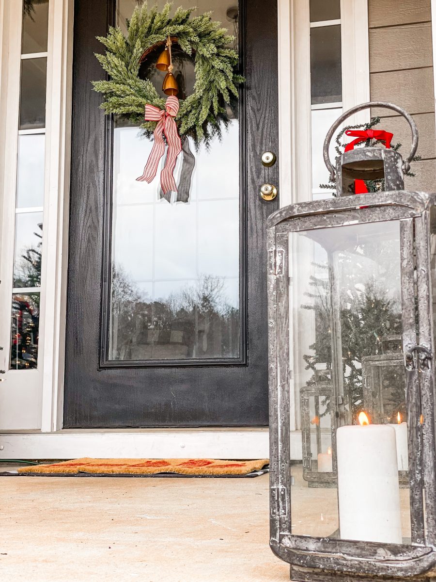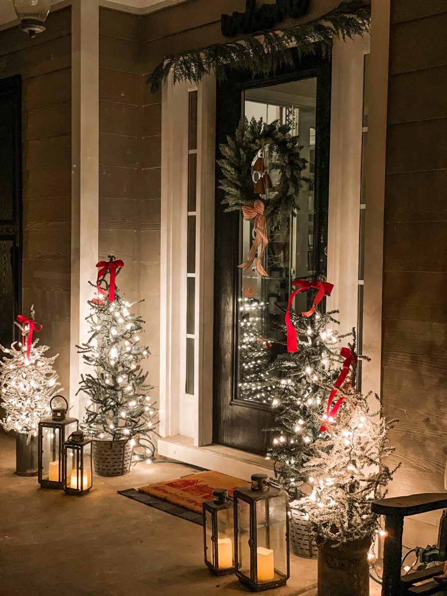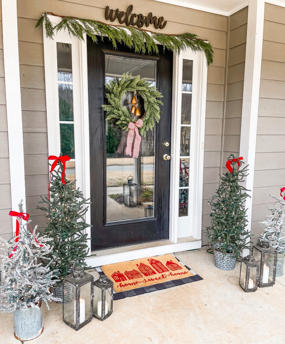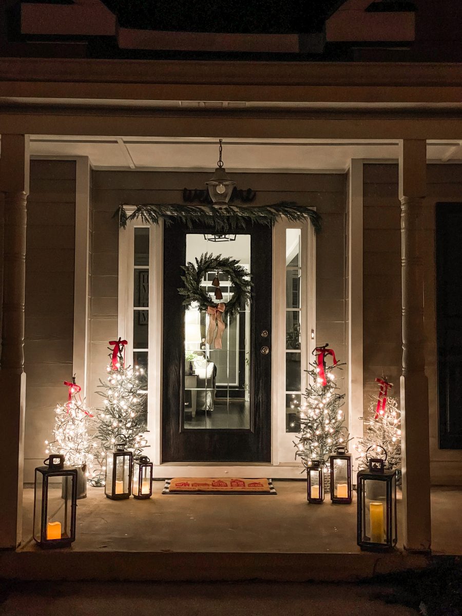 Welcome to my simple festive Christmas front porch!  I love decorating my front porch for the seasons and this year I went a bit simpler and created a simple festive Christmas theme.  Before I show you all of this year’s porch I thought it would be fun to go back and see the last 5 years of porches.  I hope it will inspire you that you don’t have to have all new decor each year and can use the same basic 5 things – garland, wreath, trees, lanterns, decor  – and rearrange them a bit to create a fresh look each year.   Our first Christmas in this house I did just a classic Farmhouse simple Christmas porch.  I was so excited to have a centered front door and be able to decorate with a lit tree on each side.  The presents are just empty boxes wrapped up with a simple bow.  Free decor!  I do suggest putting a rock or something in each box or if you get wind in our area you may end up with your faux presents in your neighbor’s yard. You can see more details on this porch here. The next year we got a short 2-hour snowfall in early December and I was ecstatic to photograph my Christmas front porch with snow falling!  Here in the South, it’s rare for us to get even one snowfall during the winter and it’s usually after Christmas so to have snow before Christmas with Christmas decor up was a bit magical. That year I used a larger flocked tree (this $30 one from Walmart) and a vintage sled and DIY JOY sign to decorate my porch.   The next year I had picked up a bunch of picket fence pieces for free off marketplace and enjoyed using them in my holiday displays creating a Farmhouse style Christmas Front Porch with picket fences.  They create a fun backdrop to decorate and since my porch is long and narrow they work well.   These fun little NOEL letters were fun to display on a ladder (they are just paper mache letters spray painted red.)   The next year I did a ski lodge theme for my porch and living room decor.  I had found that large vintage wood sled and those skis at a yard sale earlier that year and they were fun to incorporate into my Christmas decor with lots of trees and greenery.      Last year I did a classic cozy Christmas theme – incorporating dried orange slices and just classic Christmas decor.     I did use that same $30 6 foot flocked tree on the side of my porch and it was so pretty by my porch swing.     Now back to this year’s front porch!  Did you see many of the same things repeated?  I have used much of the same decor each year like the lanterns, trees, wreath on the door, garland, etc. and just rearrange it or change it up a bit each year.  I wanted just a festive simple look this year so I used the same 3 and 4 foot trees I have used many times before – I love these little trees and they are so budget-friendly.  I use them inside and outside my house in various places.  I will link them all below.