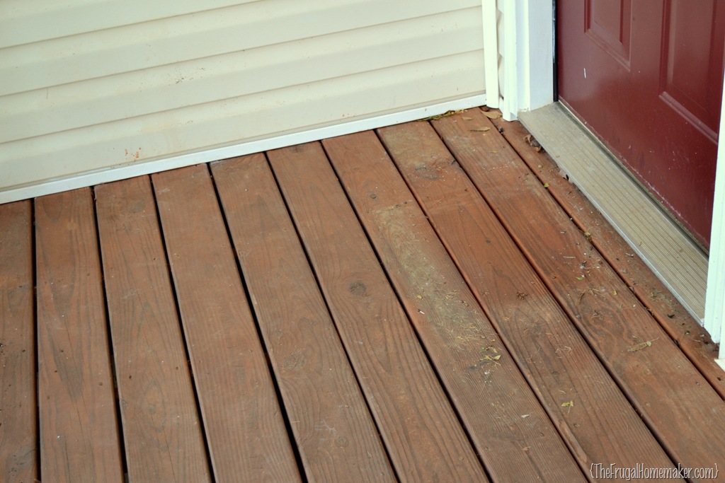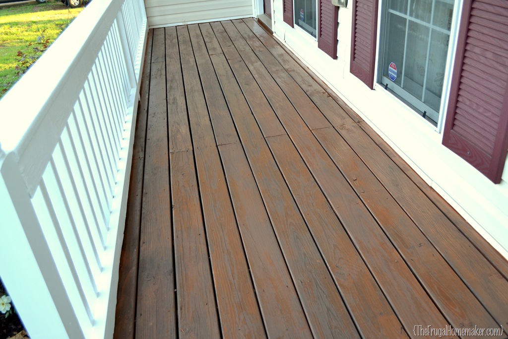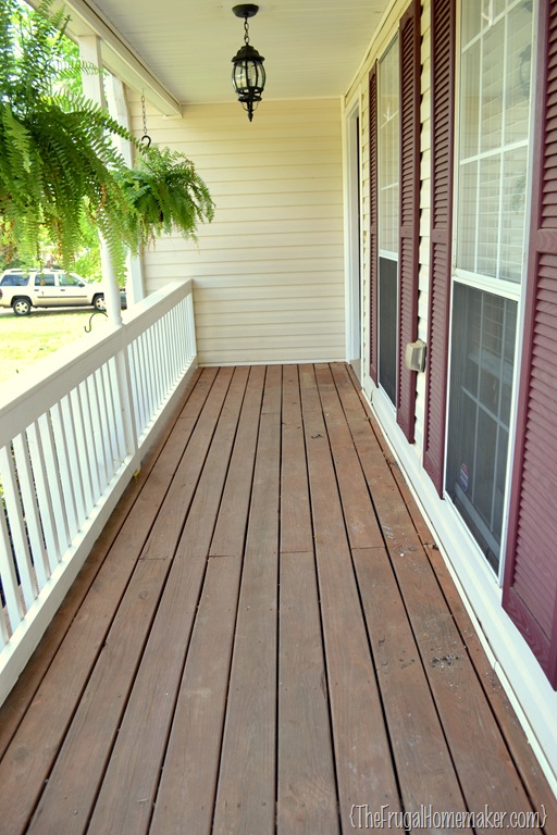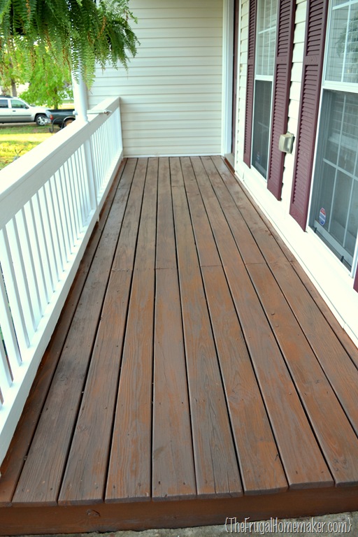 I had repainted the white rails and re-stained the deck part of the porch two years ago.  BUT that was when we had bushes that were overtaking the porch and I wasn’t able to get to the front of the porch at all to stain the decking boards or to paint the white rails.  So I decided to just re-do it all and I should be good for at least another 2 years.