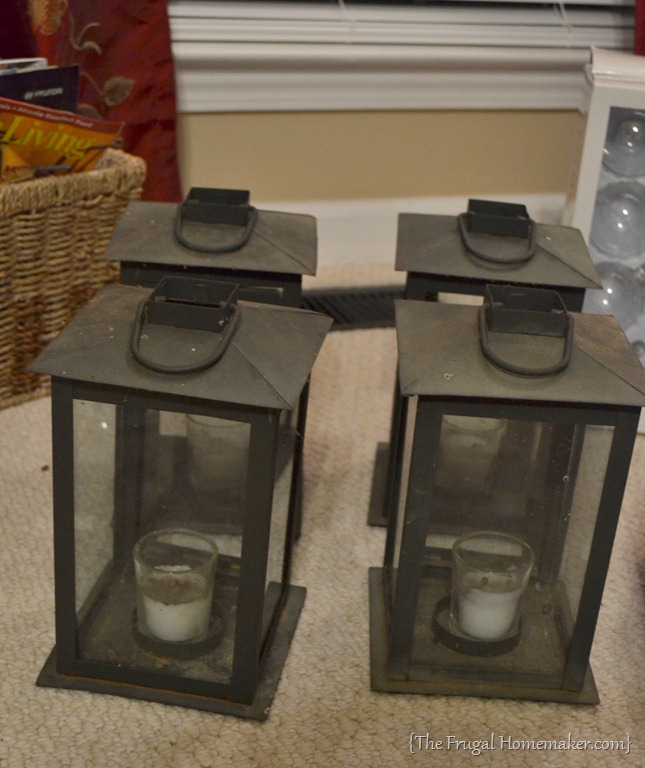 She had a box with these 4 lanterns in it and when I asked how much, she said the whole box for $2.00.  That is 50¢ each for the lanterns!  I snatched it up quick!  These are large metal lanterns and even though they might need a spruce up with some shiny black spray paint, 50¢ was a STEAL!  Wish I had steps outside and I would put them lining the steps for fall and Christmas.  I still may find a way to use them on my porch.