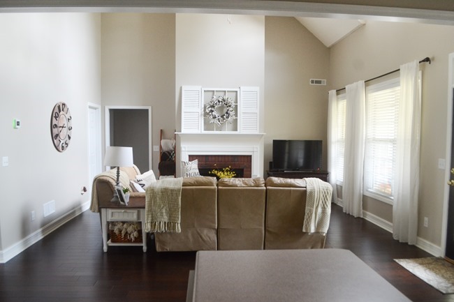 Then the next week new paint was happening!  Again I was 38 weeks pregnant by then plus 20-30 foot ceilings and angles – yep, I wasn’t about to tackle painting this room.  So I had a local friend/painter already scheduled before we moved to come paint this room.  I chose to use the same color I used in our last house (Wheat Bread by Behr) because honestly I loved it and it was a perfect taupey neutral without being too beige or too gray.  Wheat Bread is a very close match to Revere Pewter which people love too – I just still had paint left from working with Behr in the past and honestly love their paint.